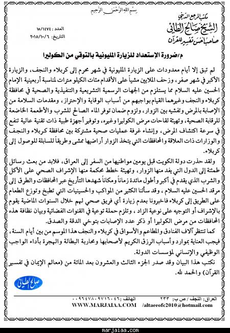 بِسْمِ اللَّهِ الرَّحْمَنِ الرَّحِيمِ العدد : 1474/15 التاريخ: 6/10/2015 م/ضرورة الإستعداد للزيارة المليونية بالتوقي من الكوليرا لم تبق إلا أيام معدودات على الزيارة المليونية في شهر محرم إلى كربلاء والنجف، والزيارة الأكبر في شهر صفر، وزحف الملايين مشياً على الأقدام مئات الكيلو مترات لمناسبة أربعينية الإمام الحسين عليه السلام مما يستلزم من الجهات الرسمية التشريعية […]